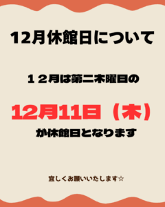 12月休館日のお知らせ☆2025.11.19 こんにちは! ワールドウィング高知です!(^^)いつもご利用いただきありがとうございます♪ 12月は第二木曜日の 12月11日(木)が休館日となっております! お間違いのないようご確認お願いいたします! LINE note 11月休館日のお知らせ☆ 前の記事 12月30日(火)営業時間についてのお知らせ☆ 次の記事